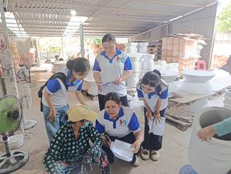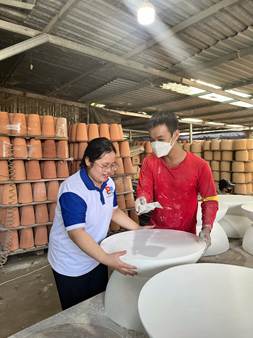 Buổi hôm sau khi đến thăm Bình Mỹ cả nhóm được chú Ba Hội cựu chiến binh dẫn đến làng gốm ở ấp An Hòa 1, gặp gỡ và trò chuyện với những người thợ đang làm việc trong xưởng. Ấn tượng đầu tiên là bụi sơn phủ khắp không gian, tiếng máy chạy, và mọi người làm việc rất chăm chỉ nhưng vẫn thân thiện. Mình được trò chuyện với cô Trinh, người đã làm việc ở xưởng lâu năm. Cô kể công việc hằng ngày là chà nhám, xịt sơn, làm theo mẫu có sẵn từ công ty, hầu hết sản phẩm là để xuất khẩu. Nghe cô nói “ngày nào đi làm cũng vui”, tự nhiên mình thấy quý nghề này, nó không hào nhoáng, không nổi tiếng, nhưng có giá trị thực sự đối với đời sống người dân ở đây.