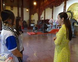 Hình 2: Chị Thúy Thơ (bìa phải) giới thiệu lịch sử Văn Miếu Trấn Biên