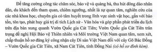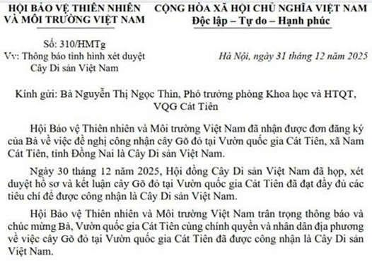 Ngay sau cuộc họp, Hội Bảo vệ Thiên nhiên và Môi trường Việt Nam đã gửi công văn số 310/HMTg ngày 30/12/2025 gửi đến Vườn quốc gia Cát Tiên thông báo tin cây Gõ Đỏ (hay còn được gọi thân quen là Cây Gõ Bác Đồng) chính thức được duyệt đưa vào danh sách đủ tiêu chuẩn công nhận là cây Di sản Việt Nam. Đây là một tin vui lớn đối với Vườn quốc gia Cát Tiên, tỉnh Đồng Nai nhân dịp đón chào năm mới 2026. Đây cũng là lần đầu tiên Vườn quốc gia Cát Tiên có cây cổ thụ độc đáo được công nhận cây Di sản.