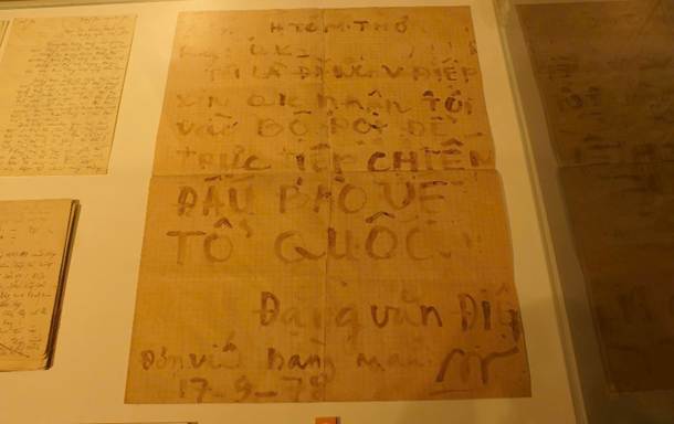 Lần này, trước mắt tôi là một chiếc tủ kính đặc biệt hơn cả: một lá thư được viết bằng máu. Đó là “Huyết thư của sinh viên Đặng Văn Điệp – Trung học chuyên nghiệp Quân khu 7, viết bằng máu xin tình nguyện đi chiến đấu ở chiến trường Tây Nam, ngày 17/9/1978”. Huyết thư không chỉ đặc biệt về mặt hình thức mà còn lay động lòng người bởi tinh thần chiến đấu, lý tưởng cao đẹp của ông cha ta.
