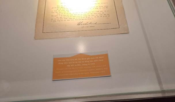 Từ khi bước vào căn phòng ký ức này, một không gian tĩnh lặng, thiêng liêng như muốn níu giữ từng khoảnh khắc của quá khứ, đập vào mắt tôi là một chiếc tủ kính nằm riêng biệt ngay cửa chính. Bên trong chiếc tủ ấy là một lá thư đặc biệt: bức thư của Bác Hồ gửi lời chúc sức khỏe, động viên cán bộ, bộ đội và đồng bào miền Nam tập kết ra Bắc vào tháng 9 năm 1954. Từng câu, từng chữ chứa đựng biết bao sự quan tâm, ấm áp và niềm tin mãnh liệt của Bác dành cho đồng bào. Đọc từng dòng, tôi cảm nhận được tình thương bao la của Bác, một tình yêu thương vô bờ bến dành cho miền Nam ruột thịt.
