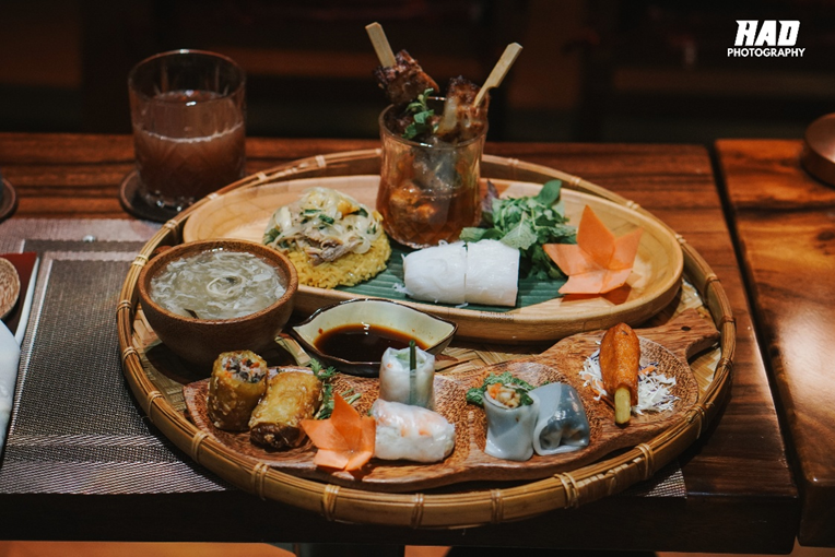 Không chỉ ấn tượng về âm nhạc và công nghệ trình diễn, một trải nghiệm khiến bản thân chúng em đặc biệt thích thú chính là thưởng thức ẩm thực Việt Nam ngay tại chương trình. Đây là lần đầu tiên bản thân em được trải nghiệm vừa xem chương trình nghệ thuật mà lại được cảm nhận văn hóa ẩm thực Việt Nam. Khi những giai điệu dân tộc vừa dứt, em được phục vụ các món ăn truyền thống đại diện cho ba miền Bắc – Trung – Nam. Với các món khai vị như sau: Súp gà tuyết nhĩ nấm đông cô, nem rán, gỏi cuốn, phở cuốn nấm thịt nướng, chạo sả. Hai món chính khiến em đặc biệt ấn tượng đó là: Cơm gà Hội An và bún chả Hà Nội, em cảm giác như được hòa quyện vào dòng chảy ẩm thực Việt Nam tạo cho em cảm giác không bao giờ quên khi đến nơi đây. Món cuối cùng là tráng miệng với tên cũng cực kỳ hấp dẫn và bắt mắt đó là Set tráng miệng ngũ vị Chào Show.