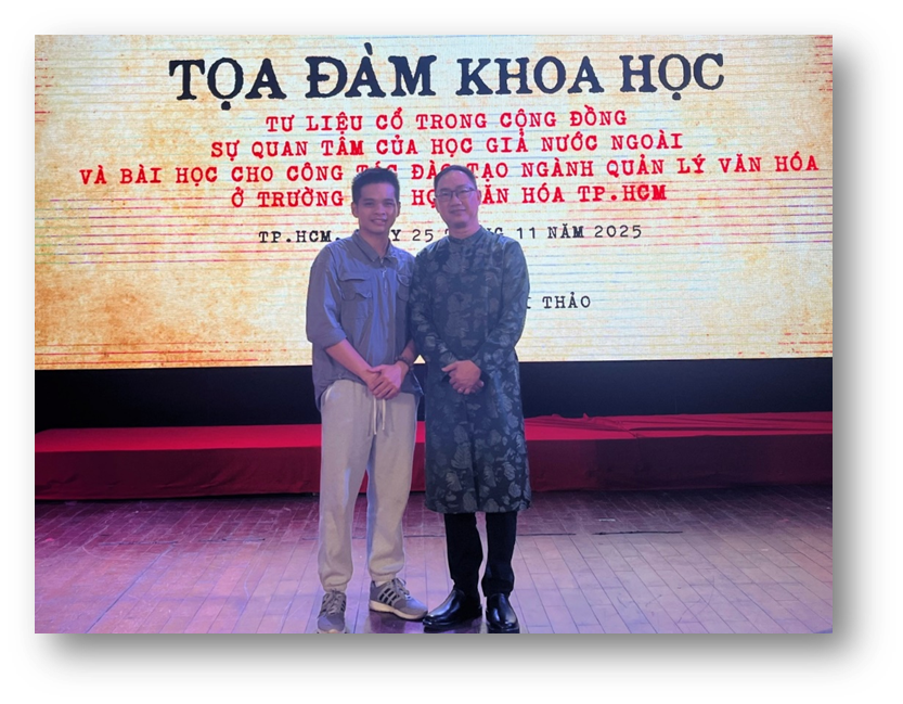Sáng ngày 25/11/2025, Khoa Quản lý văn hóa, nghệ thuật (QLVH, NT) – trường Đại học Văn hóa thành phố Hồ Chí Minh tổ chức Tọa đàm khoa học Quốc tế: “Tư liệu cổ trong cộng đồng – sự quan tâm của học giả nước ngoài và bài học cho công tác đào tạo chuyên ngành quản lý văn hóa ở trường Đại học Văn hóa thành phố Hồ Chí Minh” trực tiếp tại Hội trường C – cơ sở 1, số 51, đường Quốc Hương, phường An Khánh, thành phố Hồ Chí Minh với sự tham giá của trên 120 đại biểu đến từ Hoa Kỳ, Huế, Cà Mau, Đồng Tháp, Vĩnh Long (Bến Tre cũ)… và trực tuyến qua các đầu cầu tại Nhật Bản, Canada, Pháp, Bỉ, Thái Lan, Liên bang Nga, Hàn Quốc… và nhiều tỉnh thành ở Việt Nam như Thái Nguyên, Hà Nội, Bến Tre, Vĩnh Long… Bằng hai hình thức tổ chức, đặc biệt có sự tham gia của hơn 150 học viên sau ĐH, sinh viên các trường ĐH Osaka, ĐH Văn hóa thành phố Hồ Chí Minh Tọa đàmkhông chỉ là một diễn đàn học thuật mà còn là “một lớp học” đặc biệt dành cho giới trẻ với sự tham gia của các nhà khoa học trong nước và quốc tế, các nhà nghiên cứu, giảng viên, học viên sau ĐH, sinh viên… thể hiện tinh thần cởi mở và sự quan tâm sâu sắc đối với lĩnh vực tư liệu cổ và di sản văn hóa.