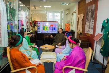 Hình 3: Nhóm sinh viên lắng nghe những lời chia sẻ vô cùng tâm huyết từ nghệ nhân áo dài Năm Tuyền.