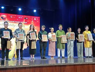 Hình 7: Nghệ nhân Năm Tuyền (thứ 4 từ phải) trong một sự kiện của Sinh viên khoa Quản lý văn hóa nghệ thuật, trường ĐH Văn hóa Tp. Hồ Chí Minh. Ảnh: 16-2.